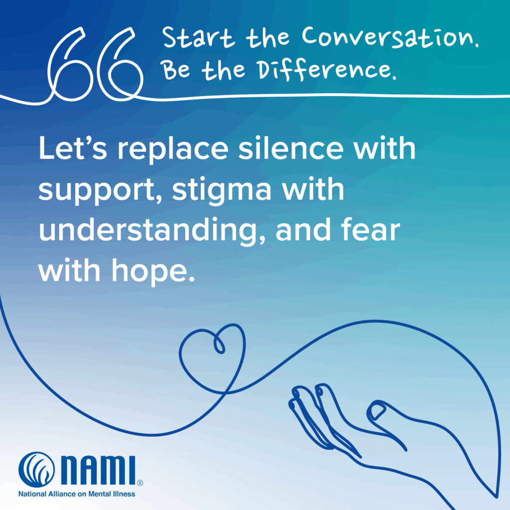 NAMI’s theme this month is, “Start a Conversation. Be the Difference.” This month, and every month, let’s remember to start the honest conversation and listen with empathy. That small act of care, compassion, and courage can make more of a difference than we realize.